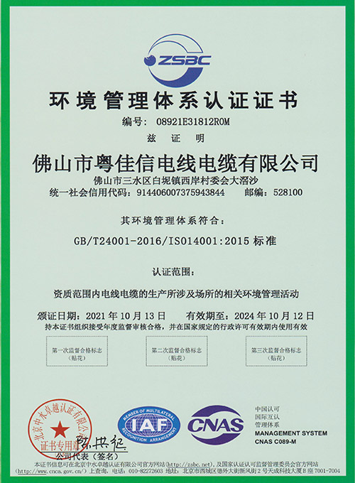 環(huán)境管理體系認證證書